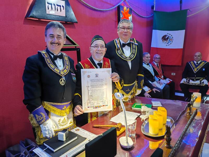 También fui honrado por el Respetable Hermano Néstor Barreto, en su calidad de Vicepresidente de SOGLIA para América del Sur, en hacer entrega al Gran Maestro de la Gran Logia Masónica Regular del Paraguay Ramón Cañete, en mi carácter como Vicepresidente de SOGLIA para México y el Caribe, de su Certificado de afiliación de la Gran Logia como miembro de la “Society of Grand Lodges in Alliance S.O.G.L.I.A.”